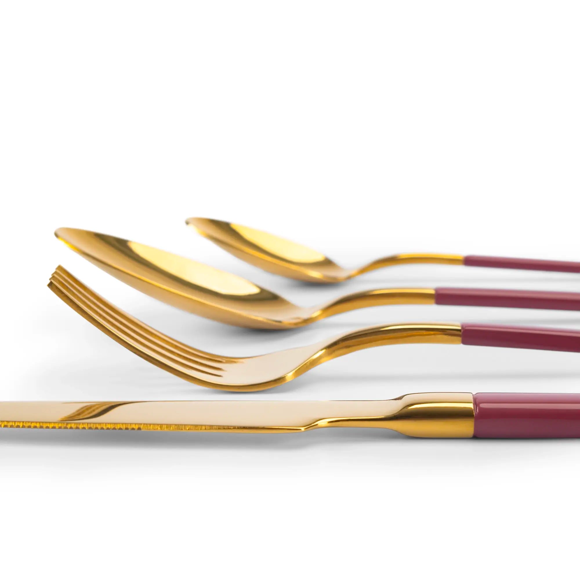 Este set de cubiertos combina la sofisticación del dorado con la sutileza del mango en tono vino, creando un contraste refinado y moderno. Cada pieza está diseñada para aportar distinción y brillo a tus comidas, convirtiendo cada ocasión en un momento especial.