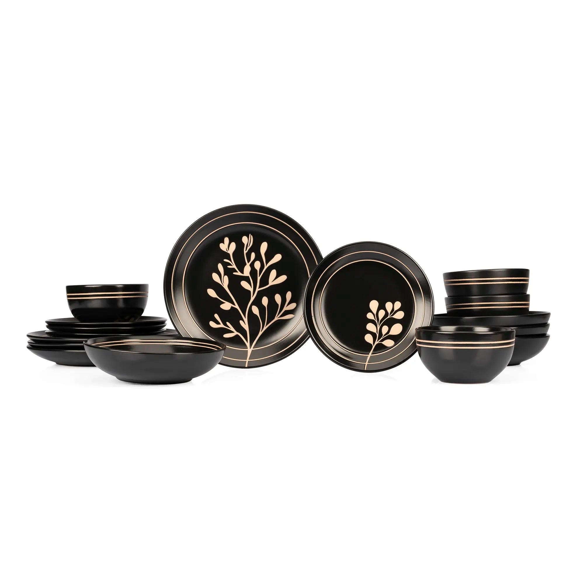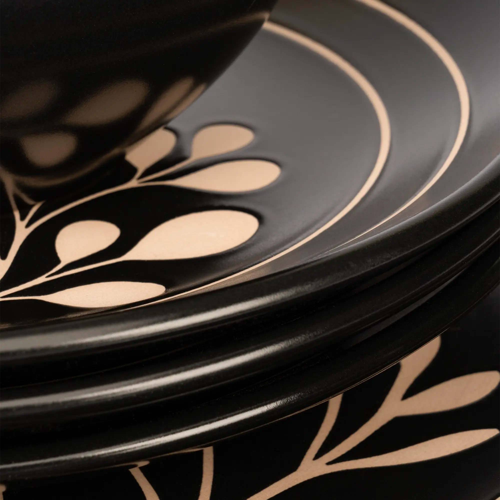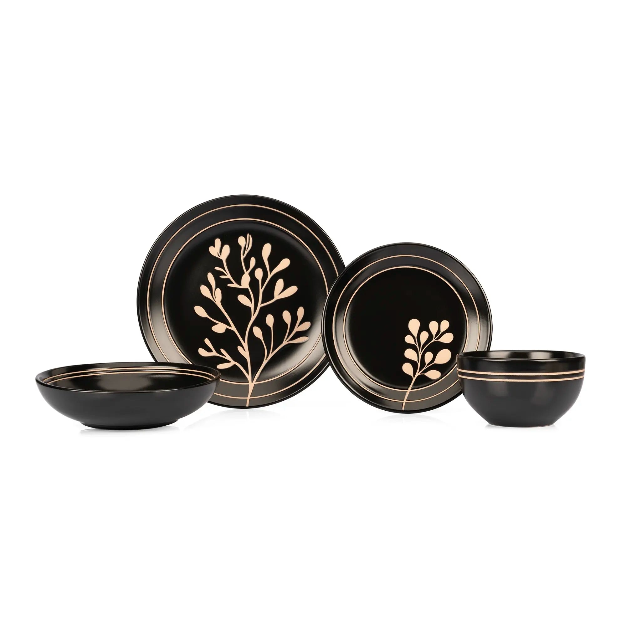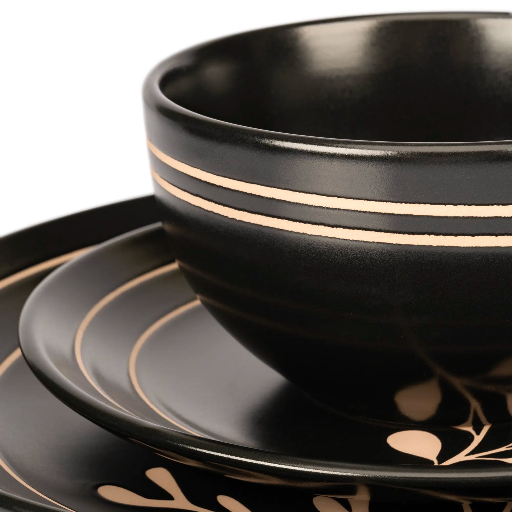 Eleva el drama y la elegancia de tus cenas con nuestra vajilla de cerámica de 16 piezas, una colección diseñada para quienes no temen destacar. Este set es la definición de lujo contemporáneo, combinando un acabado negro profundo con delicadas ilustraciones botánicas y detalles lineales en tonos bronce que capturan la luz de forma espectacular.