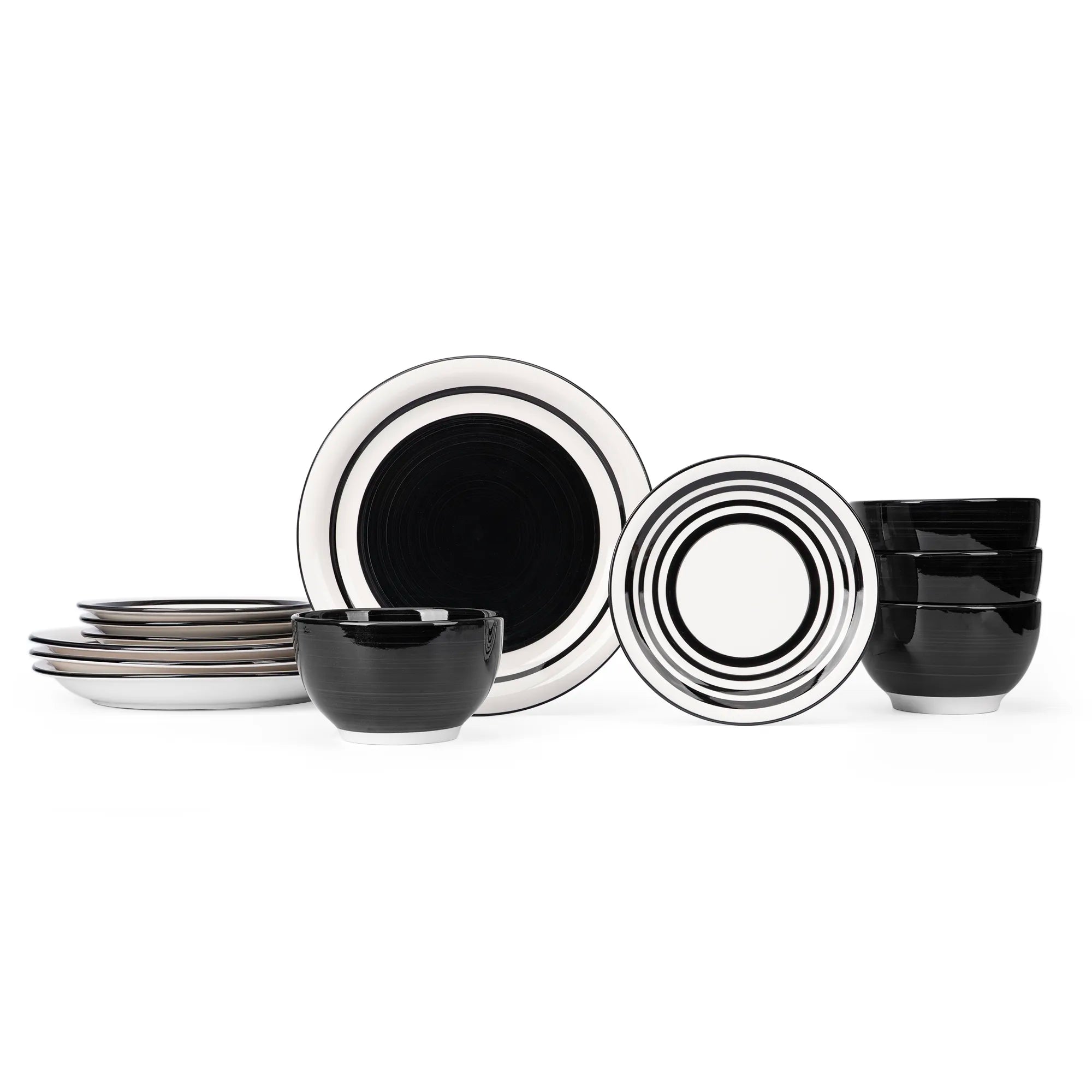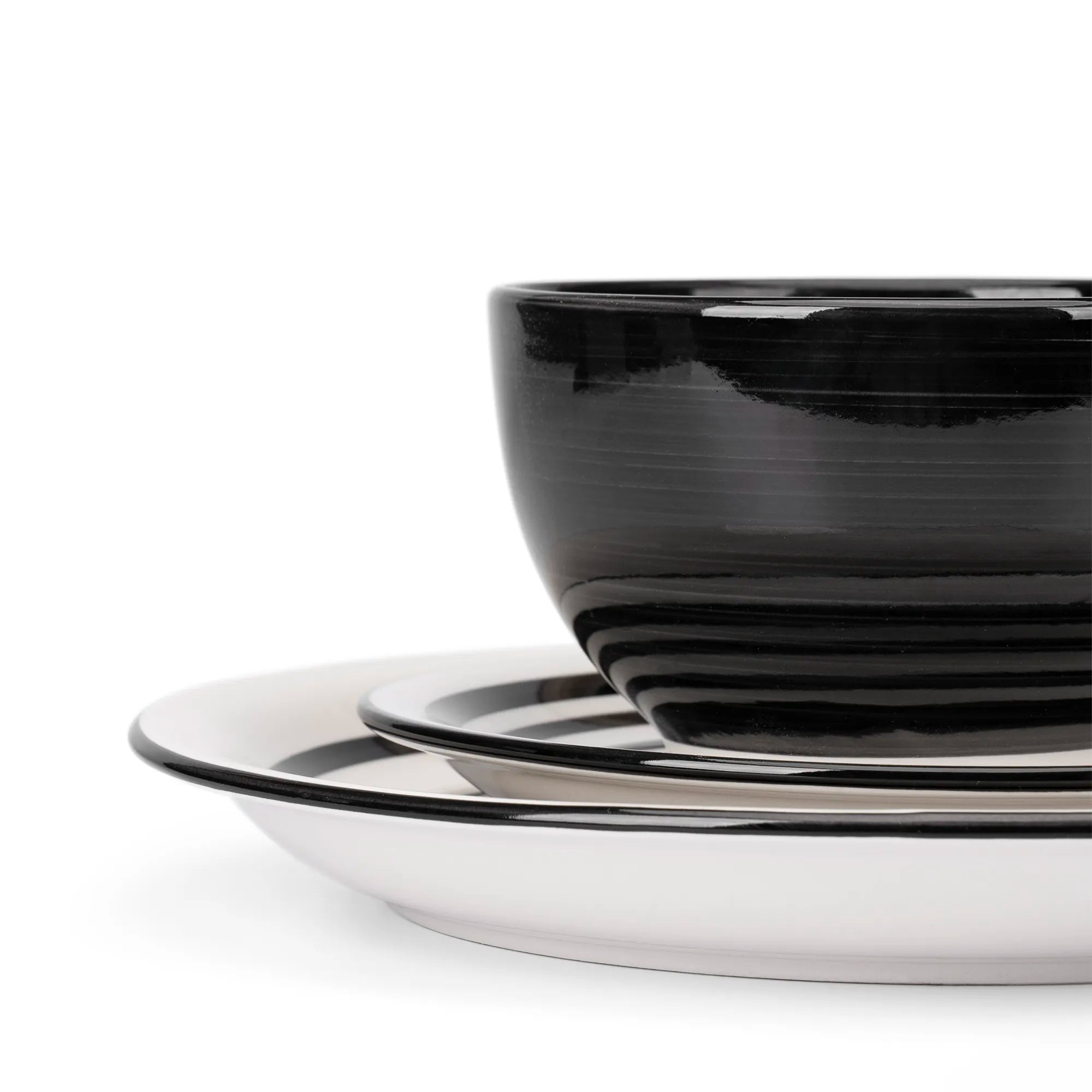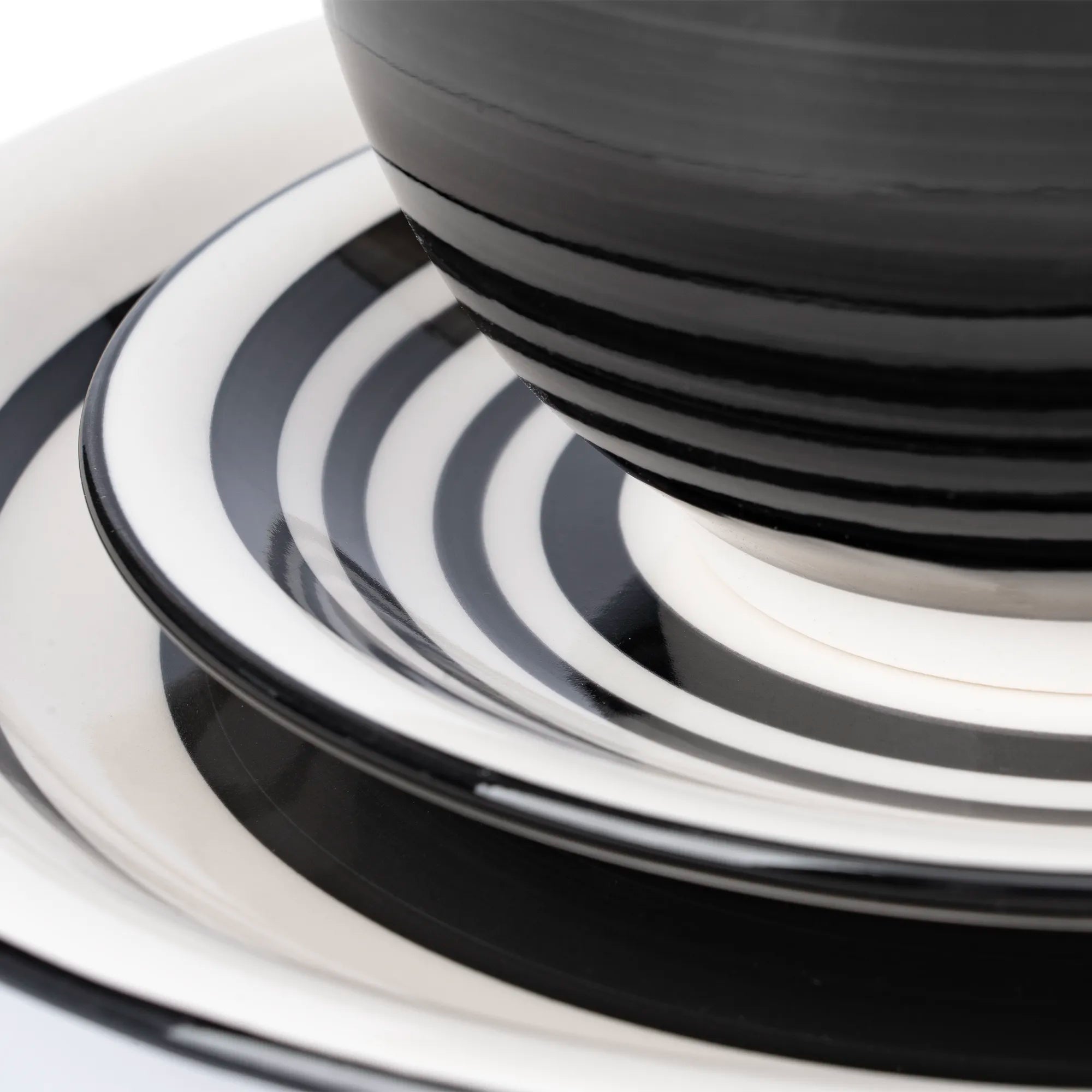 Inspirada en el torno de alfarero, su diseño de círculos concéntricos y trazos gruesos en blanco y negro aporta un aire rústico pero contemporáneo a tu mesa. La profundidad del negro en el plato principal y el bowl crea el fondo perfecto para que los colores de tus alimentos resalten como nunca.